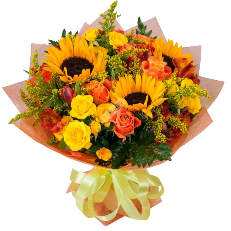 Альстромерия 5 шт., Подсолнух 3 шт., Роза 6 шт., Роза кустовая 3 шт. |