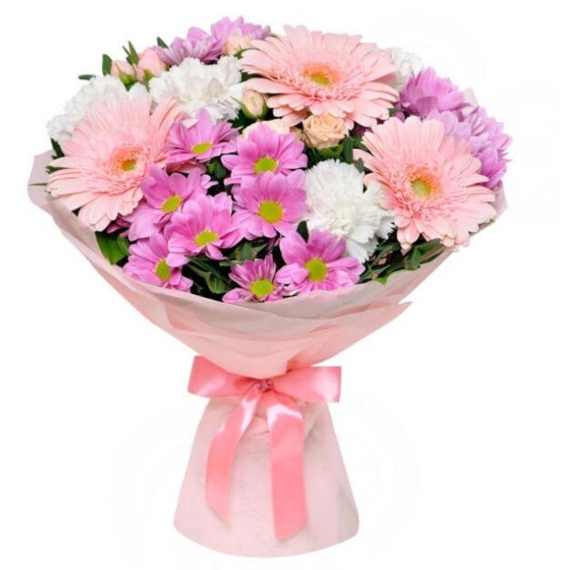 Букет состоит из 6 гвоздик, 3 розовые герберы, 4 ветки хризантемы, 2 ветки кустовой розы, красивая упаковка, атласная лента.