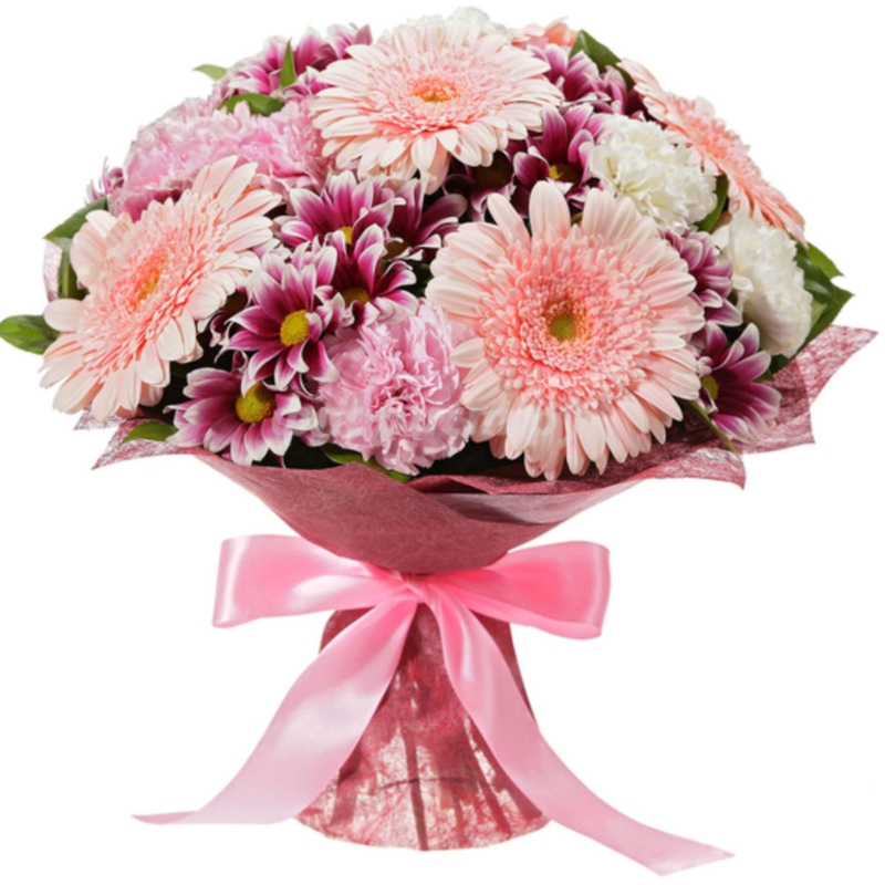 Букет состоит из 6 гербер, 5 веток хризантем, 10 белых и розовых гвоздик, салал, красивая упаковка, атласная лента.
