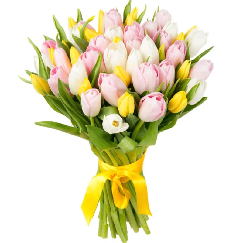 Букет состоит из MIX из 45 белых /желтых и розовых тюльпанов, прозрачная упаковка, атласная лента.