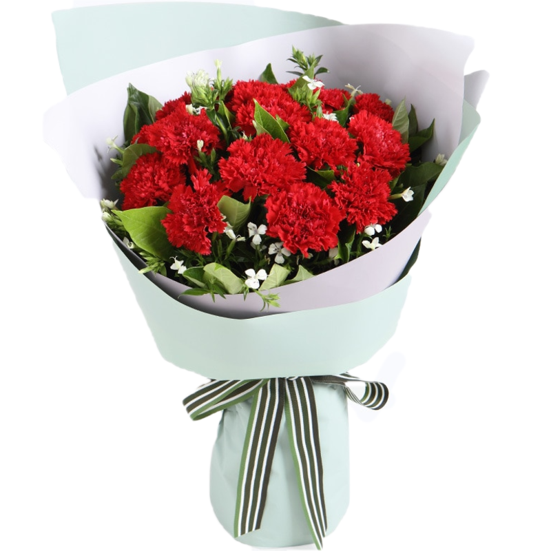 Букет состоит из 15 красных гвоздик, 2 ветки акации, зелень, красивая упаковка, атласная лента.