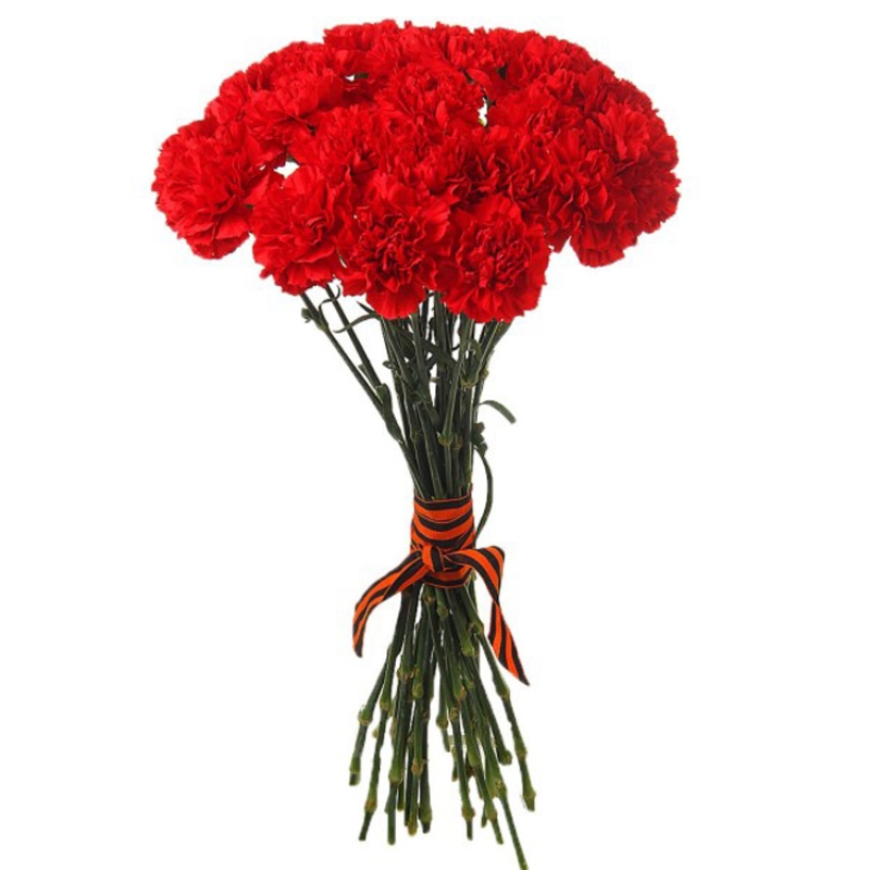Букет состоит из 21 красная гвоздика, прозрачная упаковка, атласная лента.