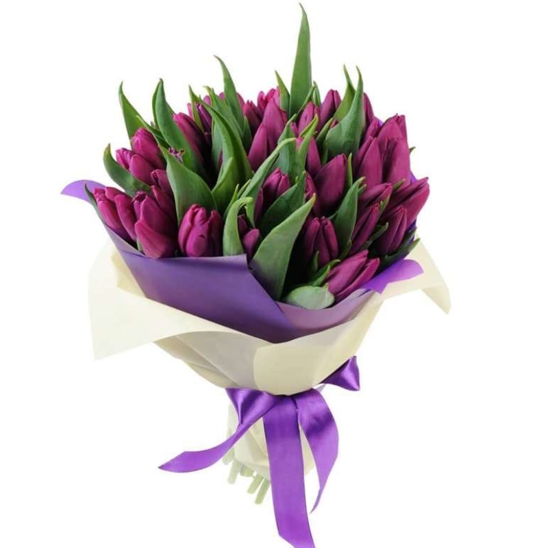 Букет состоит из 29 сиреневых тюльпанов, красивая упаковка, атласная лента.