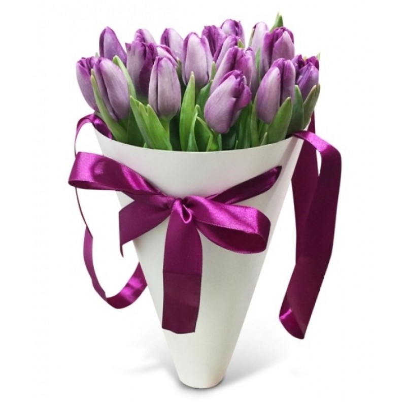Букет состоит из 19 сиреневых тюльпанов, конус, атласная лента.