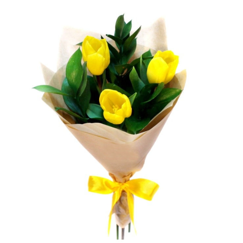 Букет состоит из 3 желтых тюльпана, рускус, крафт, атласная лента.