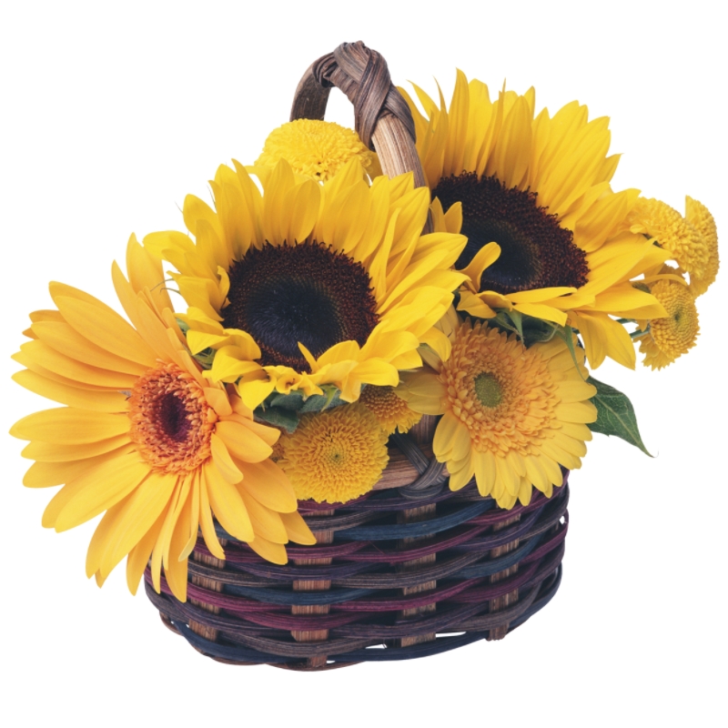 Букет состоит из 2 подсолнуха, 3 гербера, 2 ветки хризантемы, корзина, оазис.