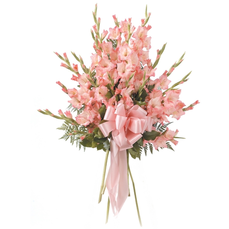 Букет состоит из 19 розовых гладиолусов, зелень, прозрачная упаковка, атласная лента.