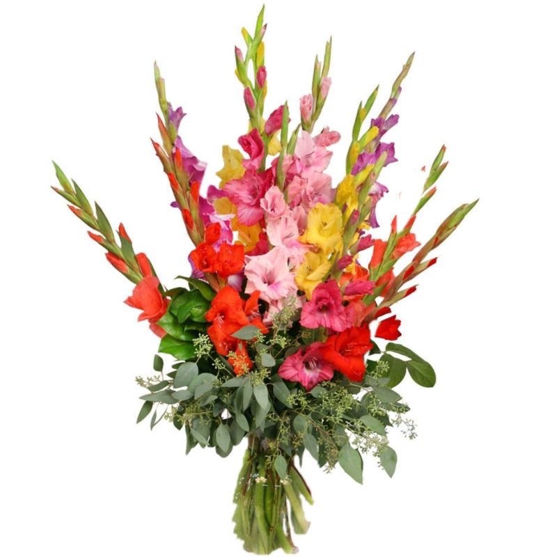 Букет MIX из 15 гладиолусов с зеленью