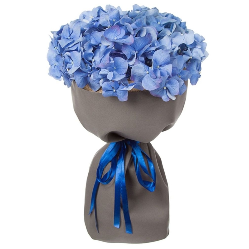 Букет состоит из 1 голубая гортензия, крафт, атласная лента.