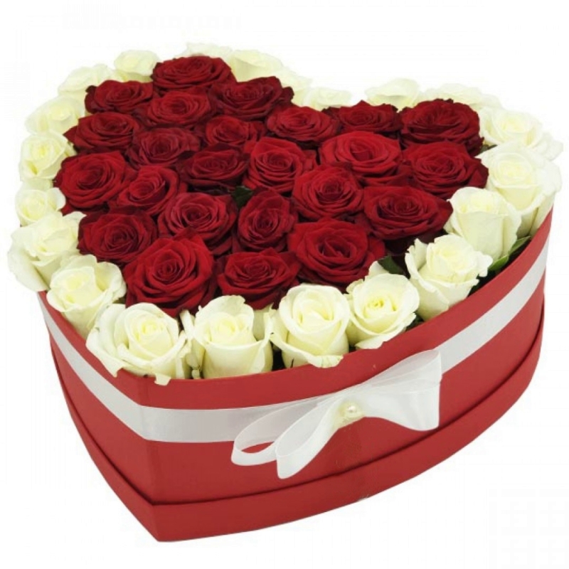 51 красная и белая роза, коробка в виде сердца.