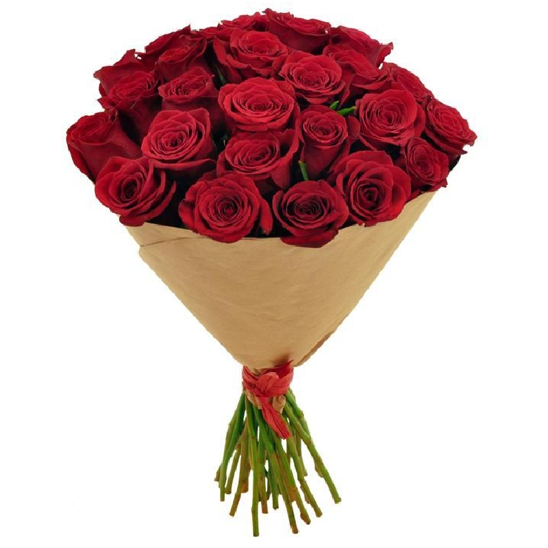 Букет состоит из 27 бордовых роз, крафт, атласная лента.