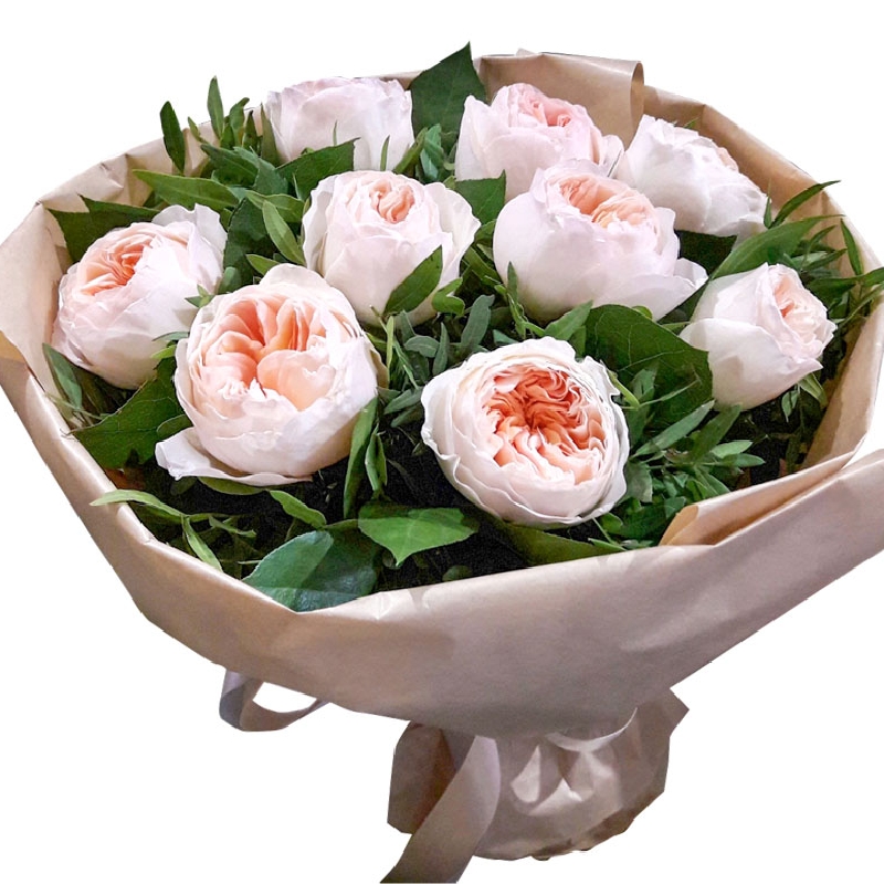 Букет состоит из 9 пионовидных роз, декоративная зелень, крафт, атласная лента.