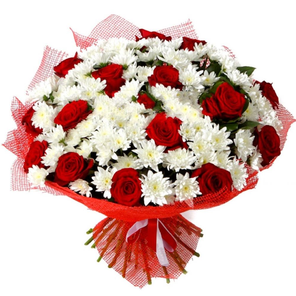 Букет состоит из 17 красных роз, 15 веток белой хризантемы, красивая упаковка.
