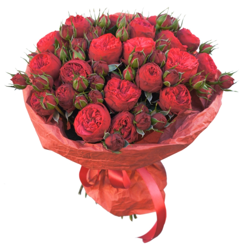 Букет состоит из 21 ветка кустовой розы Red Piano, крафт, атласная лента.