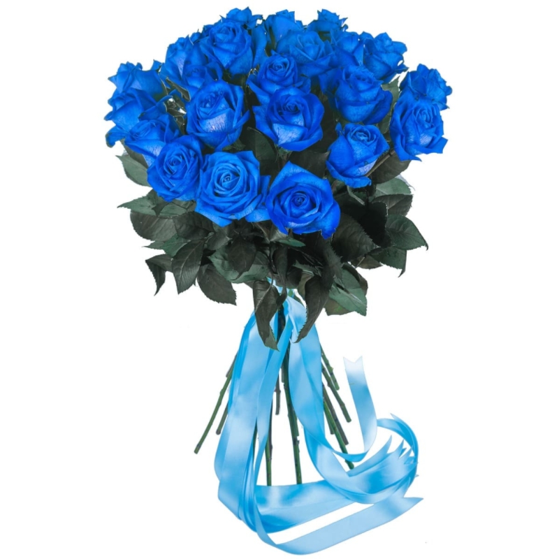 Букет состоит из 23 синие розы, прозрачная упаковка, атласная лента.